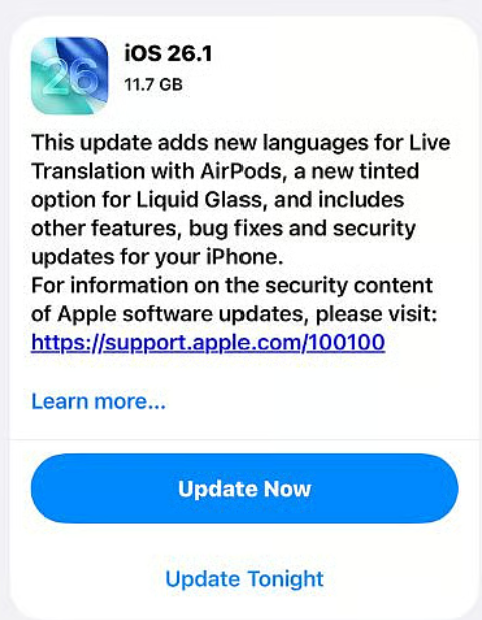 Na de release van iOS 26 in september, tegelijk met de lancering van de iPhone 17, is nu de eerste grote update voor het huidige iPhone-besturingssysteem beschikbaar. De patch van ongeveer 4,6 GB introduceert onder andere de mogelijkheid om de transparantie te verminderen en om Apple's "Liquid Glass" te kleuren om de leesbaarheid van tekst te verbeteren.