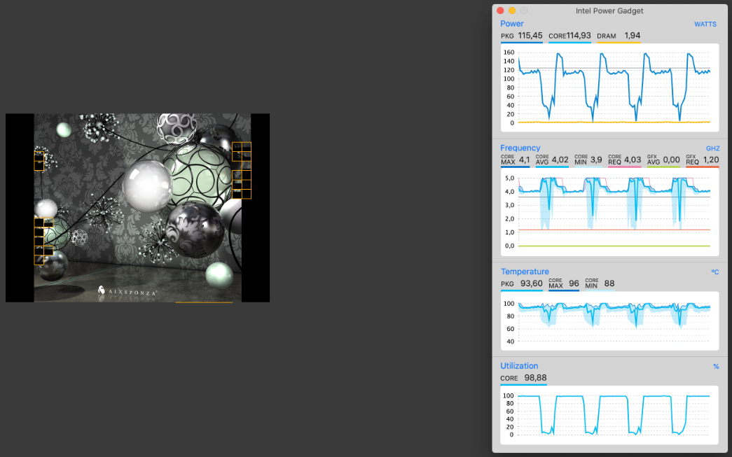 De prestatiebenutting in de stresstest is echter niet bijzonder goed, omdat de processor slechts bij ongeveer 65 Watt (10x 3.0 GHz) draait, wat beduidend minder is dan de TDP-aanbeveling van 125W. De grafische kaart loopt ook op ongeveer 50% van de maximale klok. Al met al toont dit aan dat de koeloplossing van de iMac 27 onvoldoende is voor de componenten