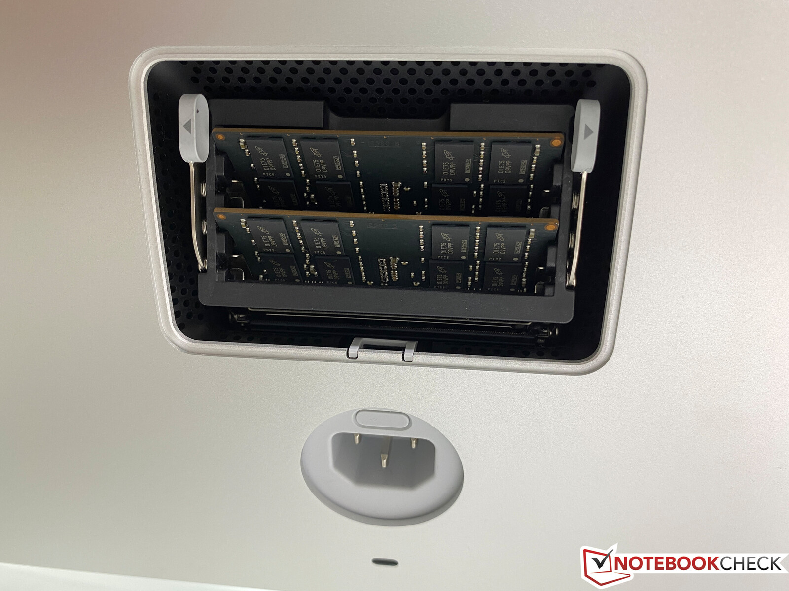 De iMac is nauwelijks overtuigend op het gebied van onderhoud. De vier RAM-sleuven zijn alleen toegankelijk via een klein afdekplaatje aan de achterzijde. Om het klepje te verwijderen, moet u een klein knopje boven de connector voor de voedingskabel indrukken. Het mechanisme zat een beetje krap op ons apparaat. Al met al is het onderhoud voor een desktop PC nog steeds zeer beperkt