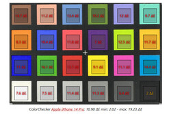 Ook een directe vergelijking van de ColorChecker-opnamen van de ultragroothoeklens en de macrolens laat vrij duidelijk verschillende kleuren zien, die in vergelijking met de hoofdsensor veel fletser en minder verzadigd zijn.