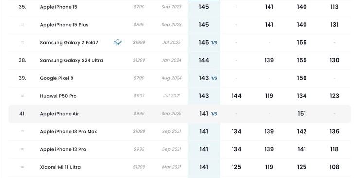 De Motorola Edge 70 laat zien dat het niet zo hoeft te zijn, met drie achtercamera's in een behuizing van 5,99 millimeter. In DxOMark's gedetailleerde camera-analyse resulteert het ontbreken van speciale camera's niet verrassend in een drastische puntenaftrek, aangezien digitale zoom en panoramamodi geen speciale ultragroothoek- en telefotocamera kunnen vervangen. Met een score van 141 punten staat de iPhone Air slechts 41e op de beste lijstachter de Google Pixel 8, de iPhone 15 en de Xiaomi 15