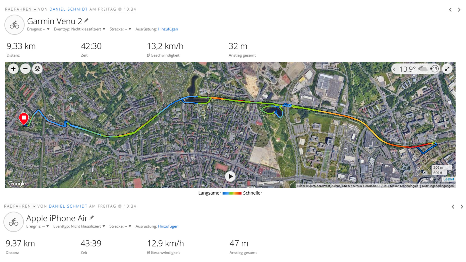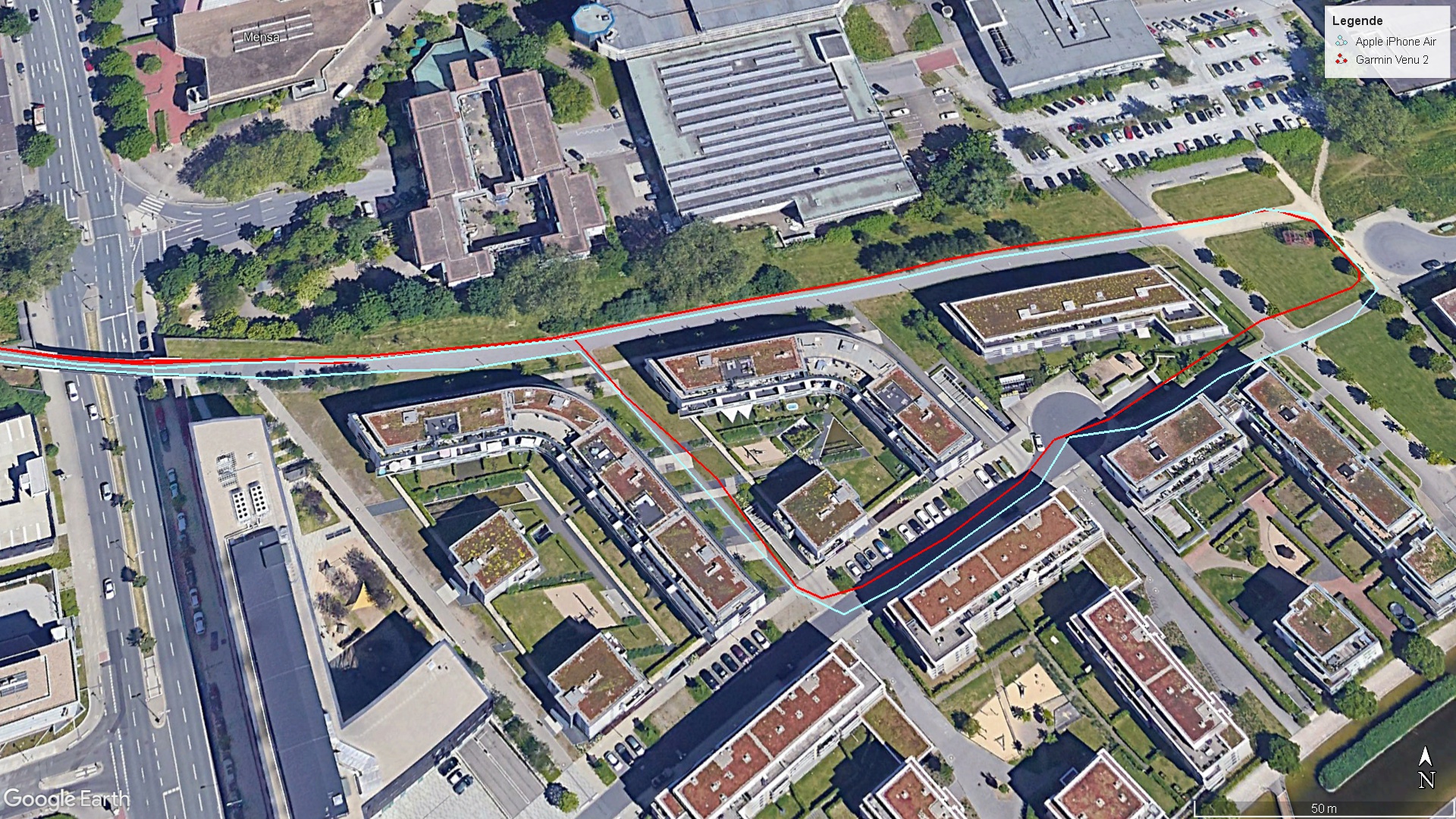 De iPhone Air bepaalt zijn positie met behulp van dual-band GNSS met alle belangrijke satellietnetwerken. Het traceren van de locatie gaat vrij snel, maar tijdens een fietstocht in het echt werd het duidelijk dat de smartphone zijn locatie met langere intervallen ophaalde, waardoor het traceren van de route niet altijd nauwkeurig was. Het is echter nog steeds prima geschikt voor navigatiedoeleinden.