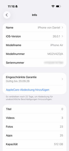 De iPhone Air wordt geleverd met Apple iOS 26, wat identiek is aan de versie op andere iPhones uit 2025.