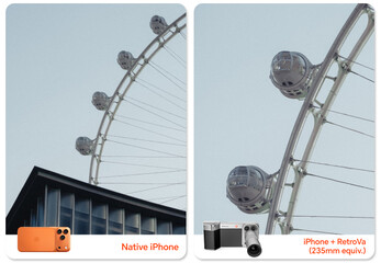 De cameragreep heeft een tweetraps ontspanknop voor scherpstellen en fotograferen, een multifunctionele knop, een zoomtuimelschakelaar en een regelknop voor het aanpassen van instellingen zoals belichting en ISO. In tegenstelling tot de camerakits voor de vlaggenschiptelefoons van Vivo en Oppo, heeft Retrova ook een microSD-kaartsleuf aan de onderkant, zodat u ProRes-video-opnamen rechtstreeks naar de geheugenkaart kunt schrijven met snelheden tot 312 MB/s. De teleconverter, die op de voorkant van de telelenzen kan worden geschroefd, verandert de 4x telelens van de iPhone 17 Pro in een 235 mm equivalent van 10x optische zoom. Bij gebruik van de 5x telelens van de iPhone 16 Pro resulteert de 2,35x vergrotingsfactor in een 282 mm equivalent 12x telelens