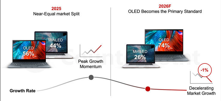 Terwijl de marktactiviteit als geheel lijkt te vertragen, zal er volgens het rapport binnenkort een grote verandering plaatsvinden in het premium beeldschermsegment. OLED notebook zendingen zullen volgend jaar naar verwachting met 33 procent groeien - in tegenstelling tot Mini LED technologie, die naar verwachting een 43 procent daling in zendingen zal zien omdat merken afstappen van het verouderende backlight systeem ten gunste van zelf-emitterende panelen.