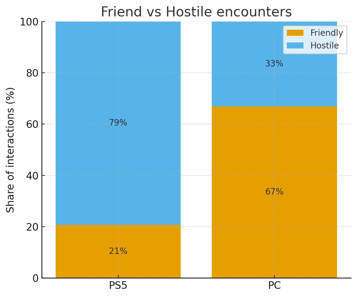 De grafieken die zijn samengesteld (zie hieronder) op basis van hun gegevens (met dank aan u/Scared-Computer502) maken dat contrast nog duidelijker. Kort samengevat vertoonden PC-spelers een hoger aandeel vriendschappelijke of coöperatieve acties, terwijl PS5-ontmoetingen resulteerden in meer backstabs en directe vijandigheid. Houd er rekening mee dat de steekproefgrootte nog steeds klein is en beperkt is tot slechts twee spelers en één speelweek, maar de kloof tussen de twee ervaringen was groot genoeg dat beiden het de moeite waard vonden om te delen. Voor deze twee spelers (in ieder geval) voelde Arc Raiders als twee verschillende spellen, afhankelijk van waar ze speelden.