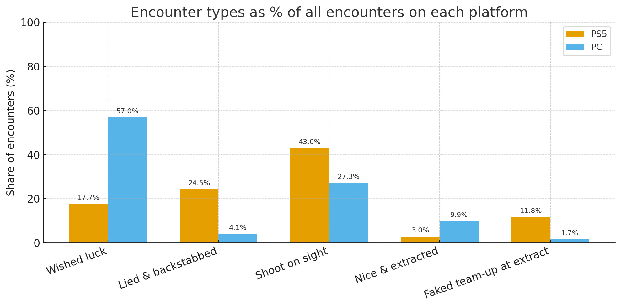 Hun aanpak was zo eenvoudig als het maar kan: speel solo, laat de wapens vallen tijdens ontmoetingen en probeer te communiceren voordat u iets doet. In een week tijd registreerden ze meer dan 400 gecombineerde ontmoetingen tussen spelers op beide platformen, waarna ze een kleine maar veelzeggende momentopname hadden van hoe de community van het spel zich gedraagt.