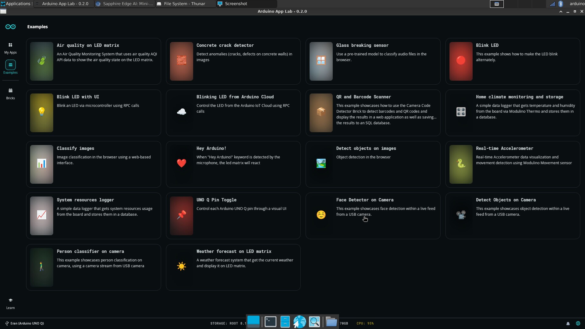 De Arduino App Lab voorbeelden zijn ook het vermelden waard. Ze laten gebruikers kennismaken met de op blokken gebaseerde https://docs.arduino.cc/software/app-lab/tutorials/bricks/ workflow en laten eenvoudige aanpassingen toe. Veel voorbeelden laten zien hoe resultaten van beeldherkenning kunnen worden weergegeven via de webinterface van een smartphone. De UNO Q kan ook functioneren als een traditioneel ontwikkelbord via Arduino IDE 2.0+, in welk geval alleen de MCU geprogrammeerd wordt in plaats van de Qualcomm APU. Een meer praktische toepassing voor de MCU alleen zou een irrigatiesysteem met vochtsensoren en pompen kunnen zijn. Voorgetrainde modellen kunnen ook nuttig zijn voor taken zoals beeldanalyse of eenvoudige spraakherkenning. Over het algemeen moeten de meegeleverde voorbeelden gezien worden als leidraad en inspiratie voor het implementeren van uw eigen projecten.