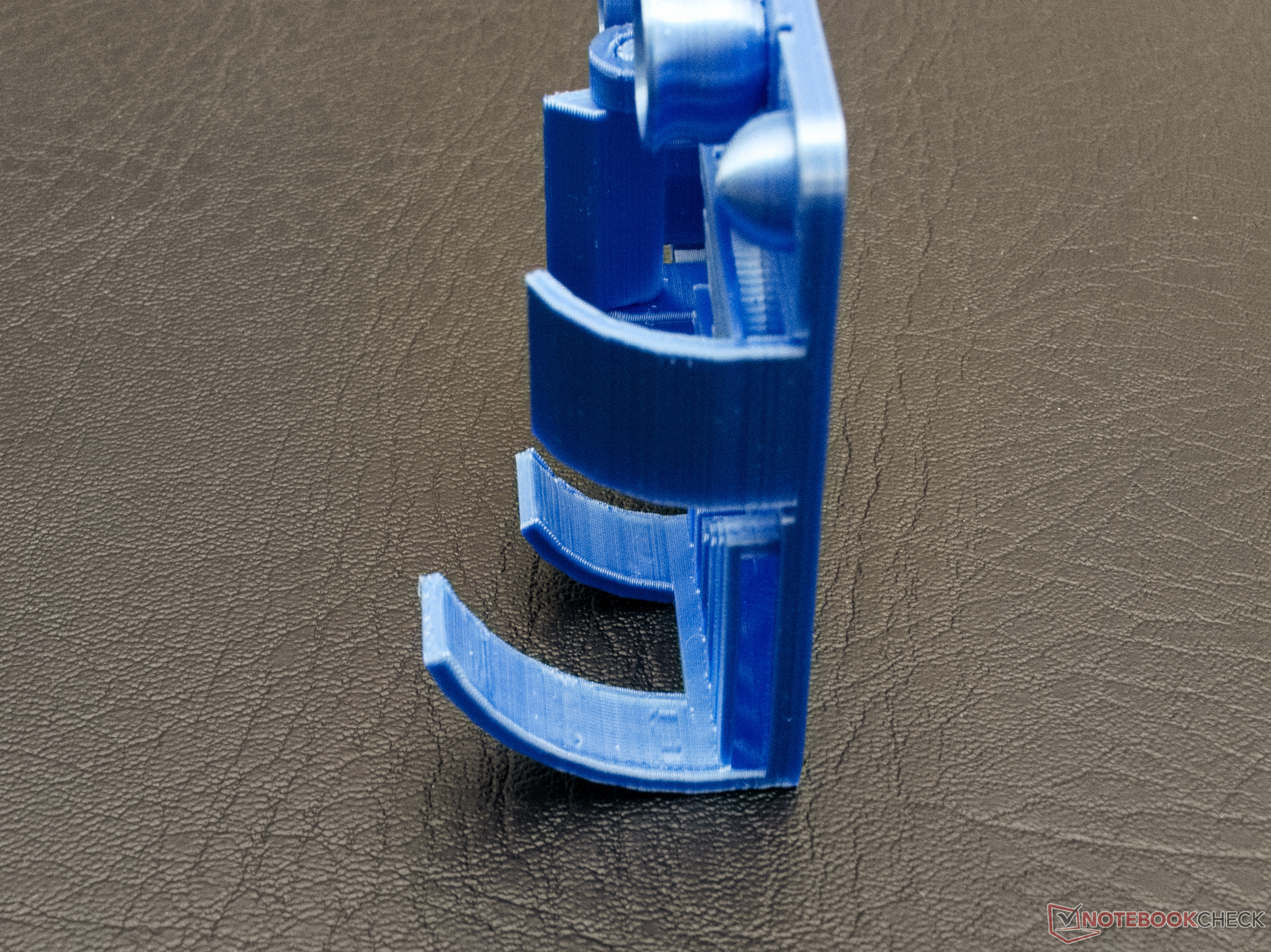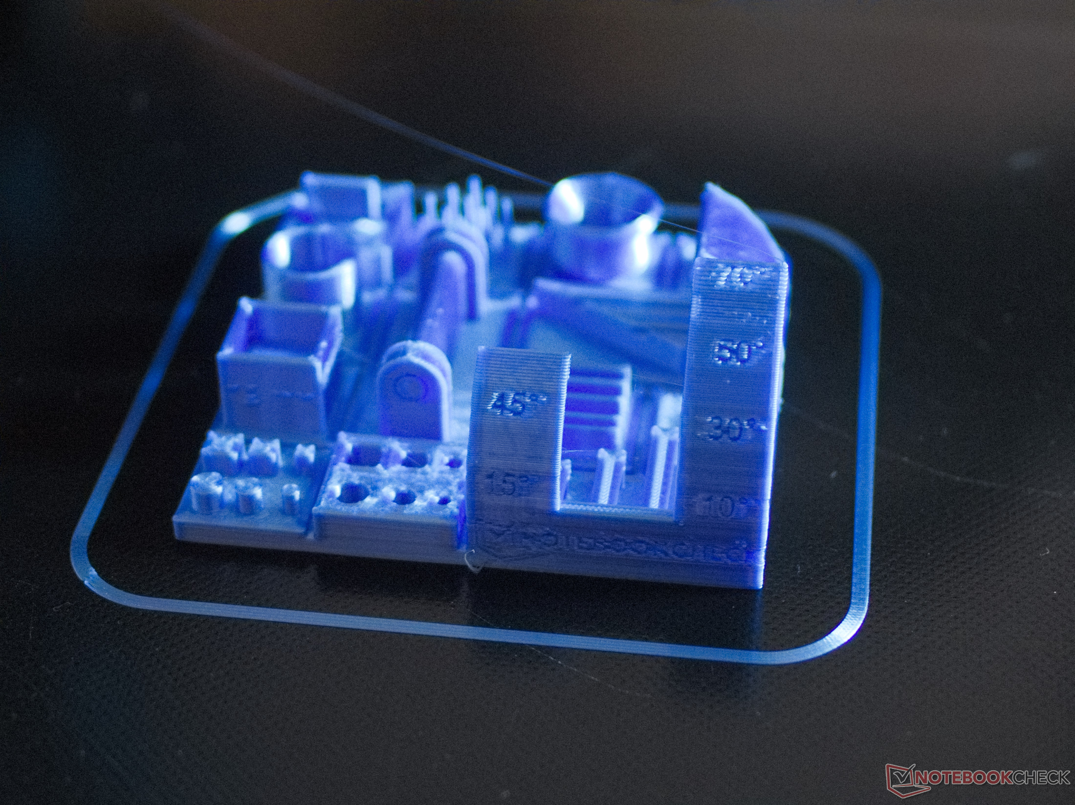 Ons testmodel (hier op Thingiverse) kan geen ernstige problemen met de 3D printer aantonen. Slechts een paar kleine foutjes tonen aan dat de retractie instellingen van het Cura profiel voor verbetering vatbaar zijn. Er zijn echter nauwelijks stringing en geen filament blobs te ontdekken. Samenvattend: alle vlakken zijn maatvast, de hechting van het printbed is optimaal en ook overstekken worden zonder problemen gemaakt. De twee print-in-place delen kunnen na het printen worden verplaatst. De printkwaliteit met het gebruikte silk-blue PLA filament is meer dan goed.