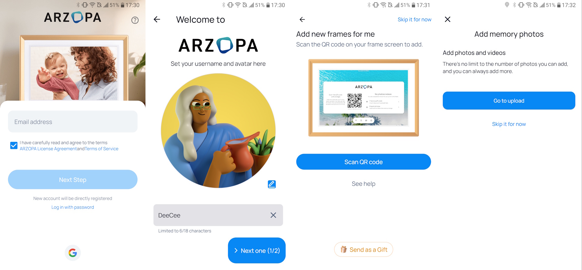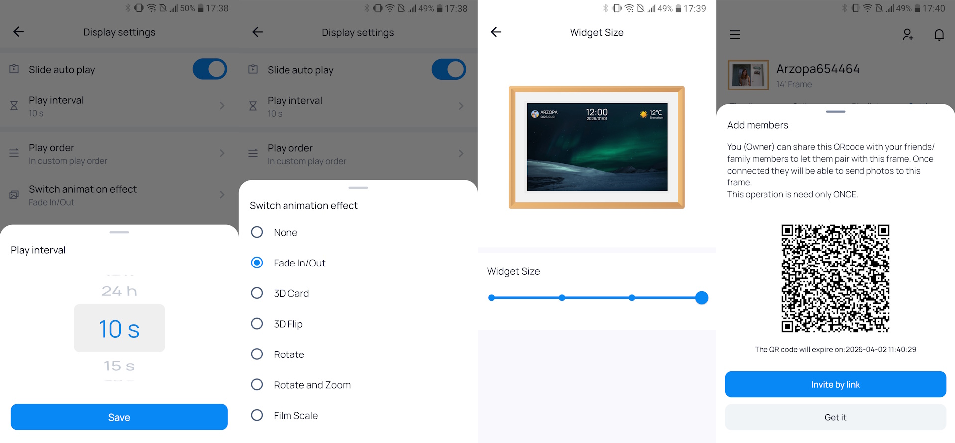 De software is eenvoudig te installeren en het toevoegen van een foto duurt slechts enkele seconden. Toegang tot het Arzopa frame kan gedeeld worden met vrienden en familie, zodat iedereen op afstand foto's kan uploaden via de app. Met de app kunnen kopers ook een zegen en foto vooraf laden voordat ze het cadeau geven, en eigenaren kunnen cadeaucodes toevoegen om extra foto's van evenementen te importeren.
