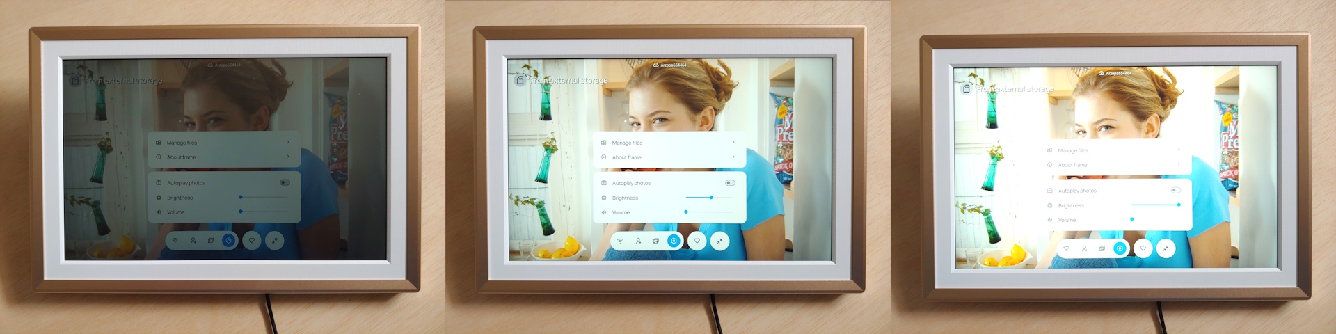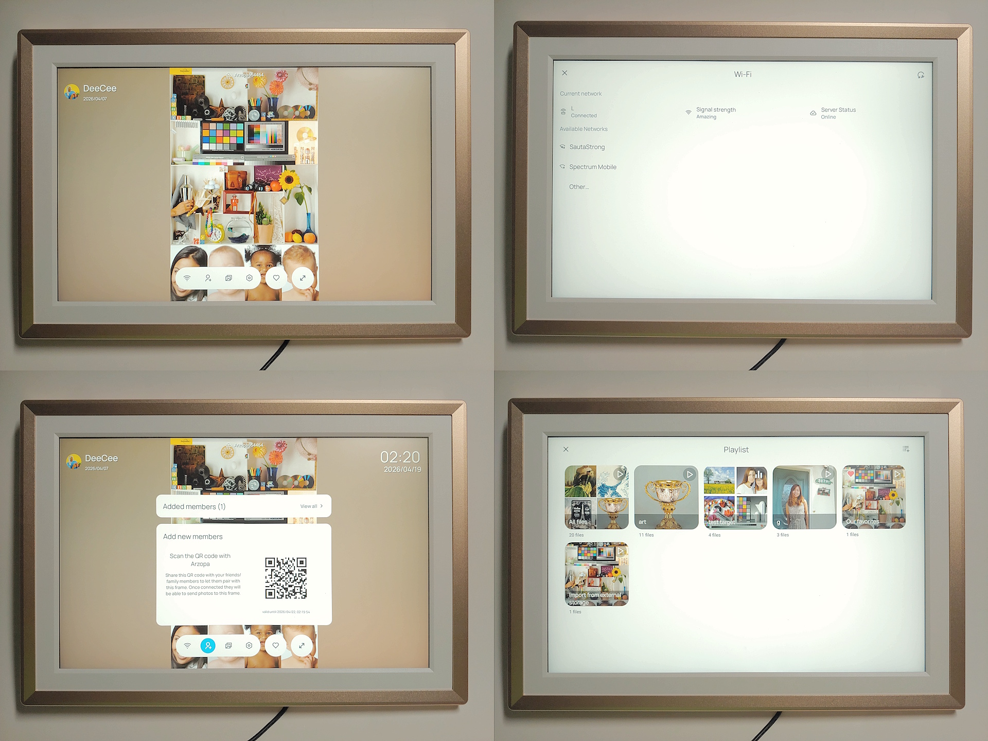 De Wi-Fi-instellingen maken het toevoegen van een nieuwe verbinding eenvoudig, hoewel proxy-netwerken niet worden ondersteund. Met de gebruikersinstellingen kunnen snel nieuwe leden worden toegevoegd die op afstand foto's kunnen uploaden. In het menu Foto's kunnen gebruikers media afspelen vanaf een SD-kaart, bestanden overzetten via USB, items verwijderen of het frame resetten, waarbij mappen beschikbaar zijn voor het organiseren van grote bibliotheken. De systeeminstellingen regelen de helderheid, het volume, het automatisch afspelen van foto's en het bestandsbeheer.