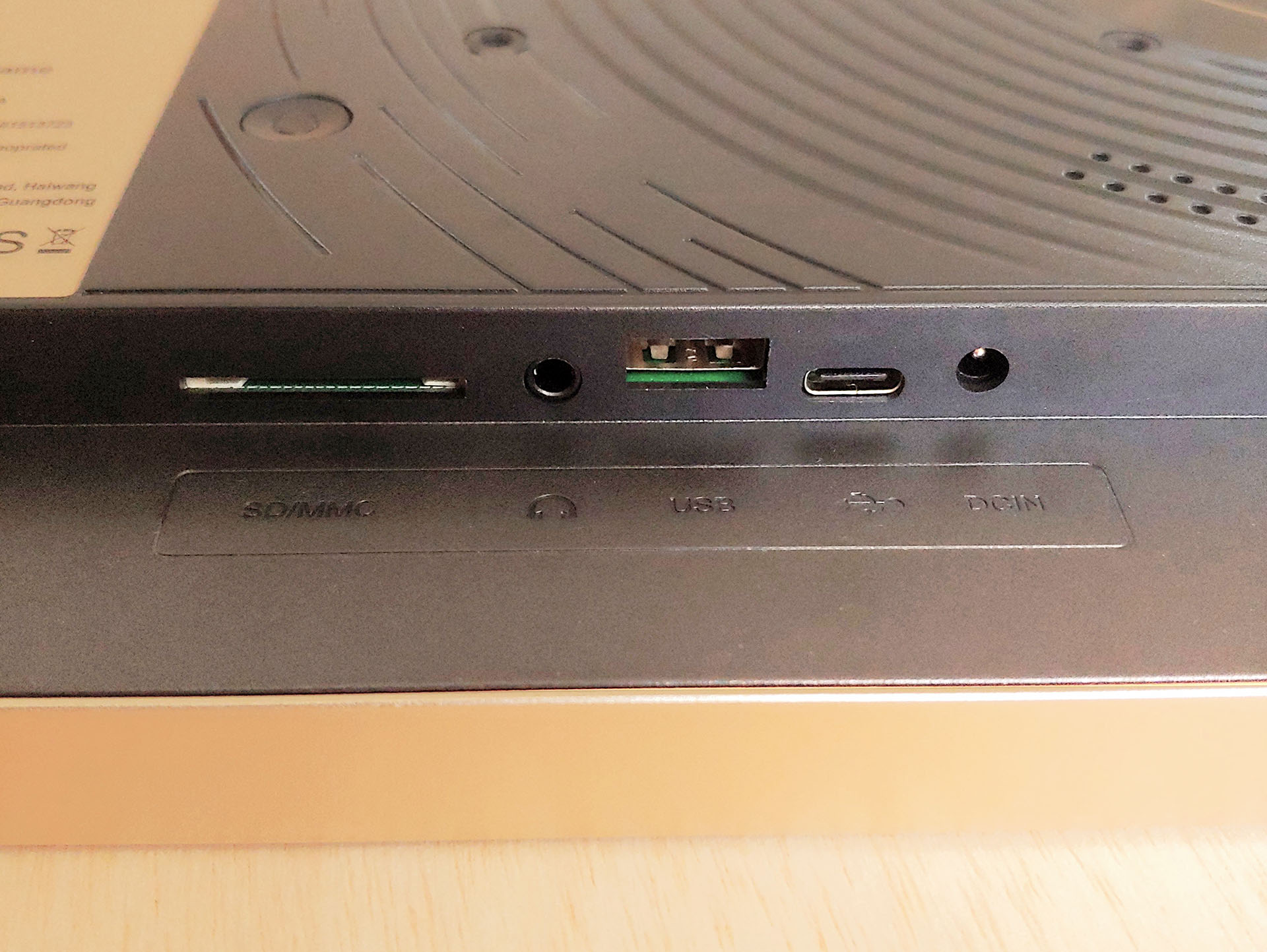 Alle poorten, inclusief voeding, USB-A, USB-C, de SD-kaartsleuf en de 3,5 mm hoofdtelefoonaansluiting bevinden zich aan de achterkant. Er is geen aan/uit-knop, dus als u de stekker in het stopcontact steekt, wordt het apparaat ingeschakeld en het uitschakelen of de slaapstand wordt via het menu geregeld.