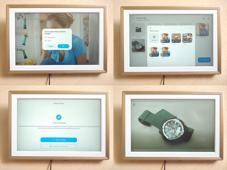De fotolijst bevat 32 GB interne opslag plus onbeperkte cloud-opslag. Gebruikers kunnen optionele bijschriften toevoegen en foto's bijsnijden voor liggende of staande oriëntatie, hoewel voor geavanceerde bewerkingen externe apps nodig zijn. Korte videoclips worden ook ondersteund.
