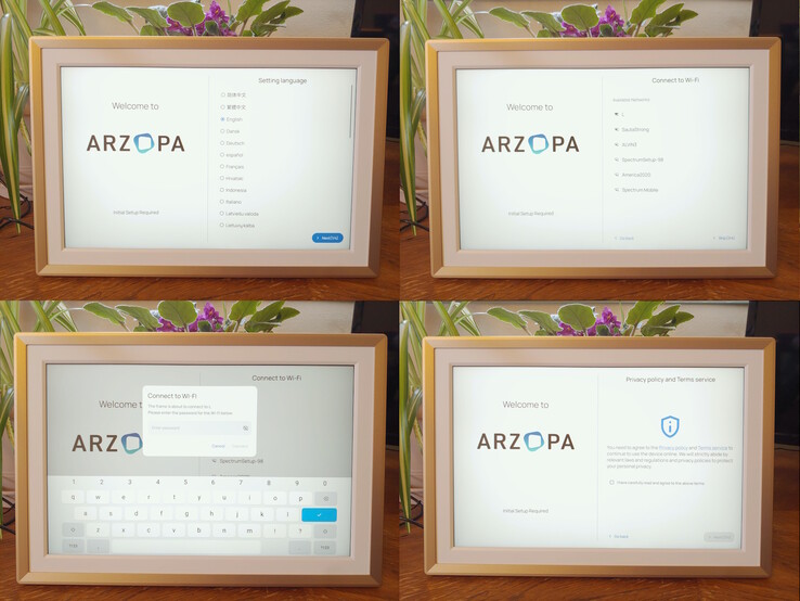 De eerste installatie van de hardware bestaat uit verschillende schermen, waaronder taalselectie, optionele Wi-Fi-installatie, akkoord gaan met de servicevoorwaarden en het privacybeleid, en tijd-/datuminstellingen. Gebruikers kunnen de QR-code op het laatste scherm delen met vrienden en familie om toegang te krijgen tot de fotolijst of een cadeaucode toevoegen om geschonken foto's te bekijken, zoals die van een bruiloft. Er was een firmware-update nodig op het beoordeelde apparaat, die enkele minuten duurde om te installeren.