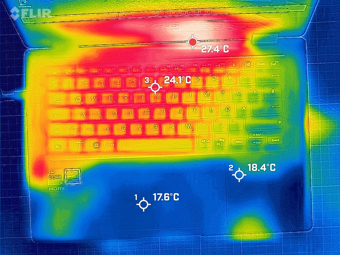De temperaturen van de Asus BR1402FG zijn constant erg goed. In ruststand hebben we slechts 24 °C aan de bovenkant en 22 °C aan de onderkant gemeten. Ook onder belasting blijven de temperaturen binnen de perken. Er is een hotspot van 41 °C in het midden boven het toetsenbord aan de bovenkant. Gemiddeld is de temperatuur aan de bovenkant echter 28,4 °C en aan de onderkant hebben we gemiddeld 28 °C gemeten.