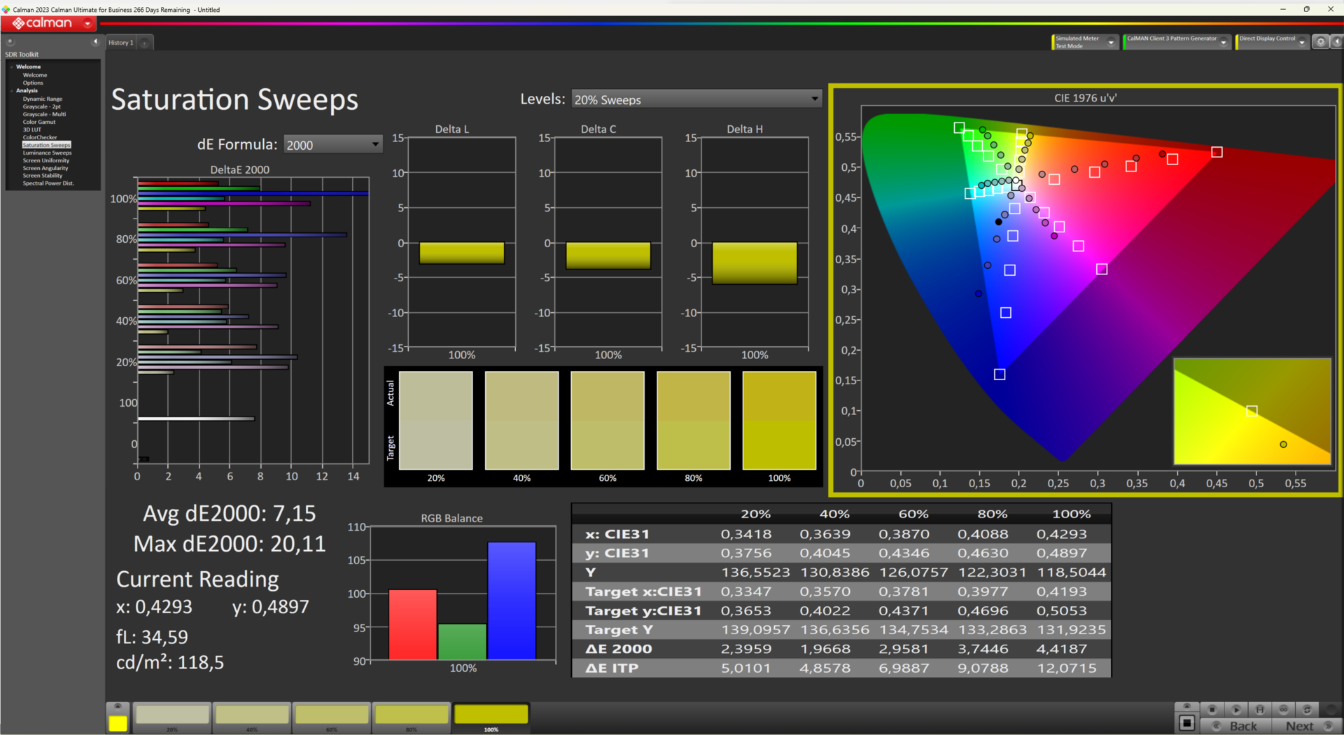 Met de kalibratie konden we een aanzienlijke verbetering van de gemiddelde DeltaE-waarden van de grijstinten meten. De gemiddelde waarde van 6,3 werd verbeterd tot een zeer goede 0,6. De kleurkalibratie liet ook een aanzienlijke verbetering zien met een oorspronkelijke DeltaE-waarde van 7,02, die verbeterde naar 4,25. Verzadiging vertoonde de minste verbetering na kalibratie, dus hier werd slechts een gemiddelde DeltaE-waarde van 6,59 bereikt.