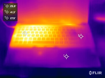 In de ruststand blijft de Asus ExpertBook B1 lekker koel. Toch hebben we ook onder belasting geen kritieke hotspots gedocumenteerd. Afvalwarmte wordt voornamelijk afgevoerd via een ventilator die de lange heatpipe van verse lucht voorziet. De processor zelf blijft erg koel met een gemiddelde van 66 °C. De piektemperatuur bedroeg slechts 74,6 °C, wat betekent dat Asus wat speelruimte weggeeft wat betreft de mogelijke prestaties van de laptop.