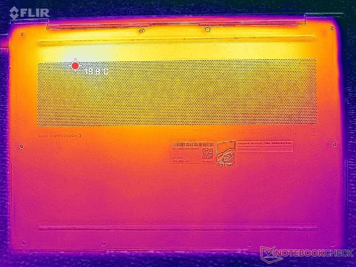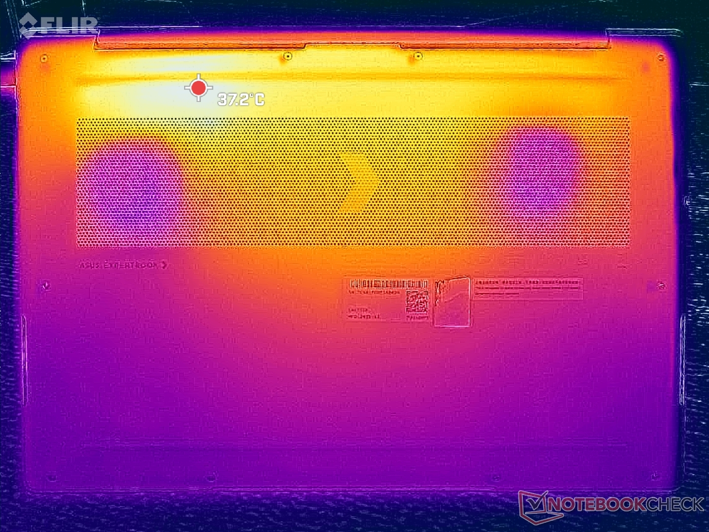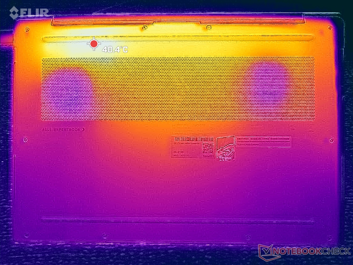 De temperatuurgradiënt op het oppervlak is min of meer symmetrisch dankzij de koeloplossing eronder. De hete plekken in het midden van het toetsenbord en op het onderpaneel kunnen elk tot 41 C bereiken bij langdurige zware belasting, wat iets koeler is dan op de HP EliteBook Ultra G1i 14 uitgerust met een langzamere Lunar Lake-V CPU.