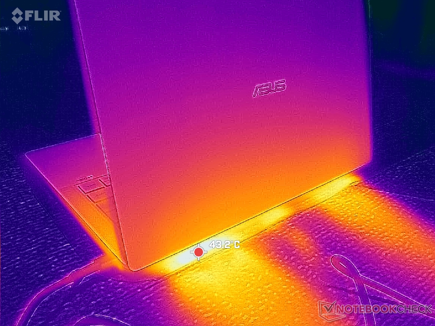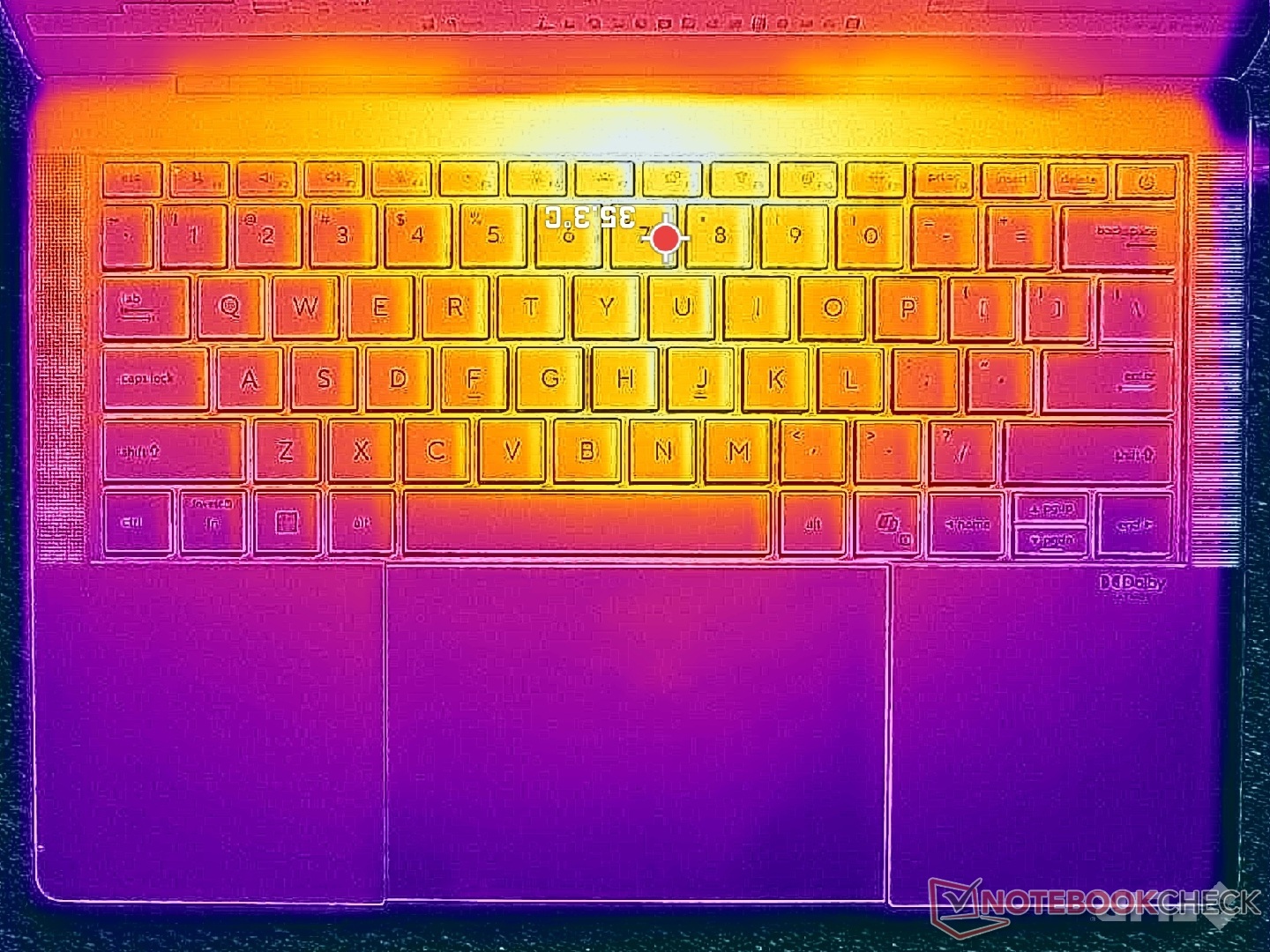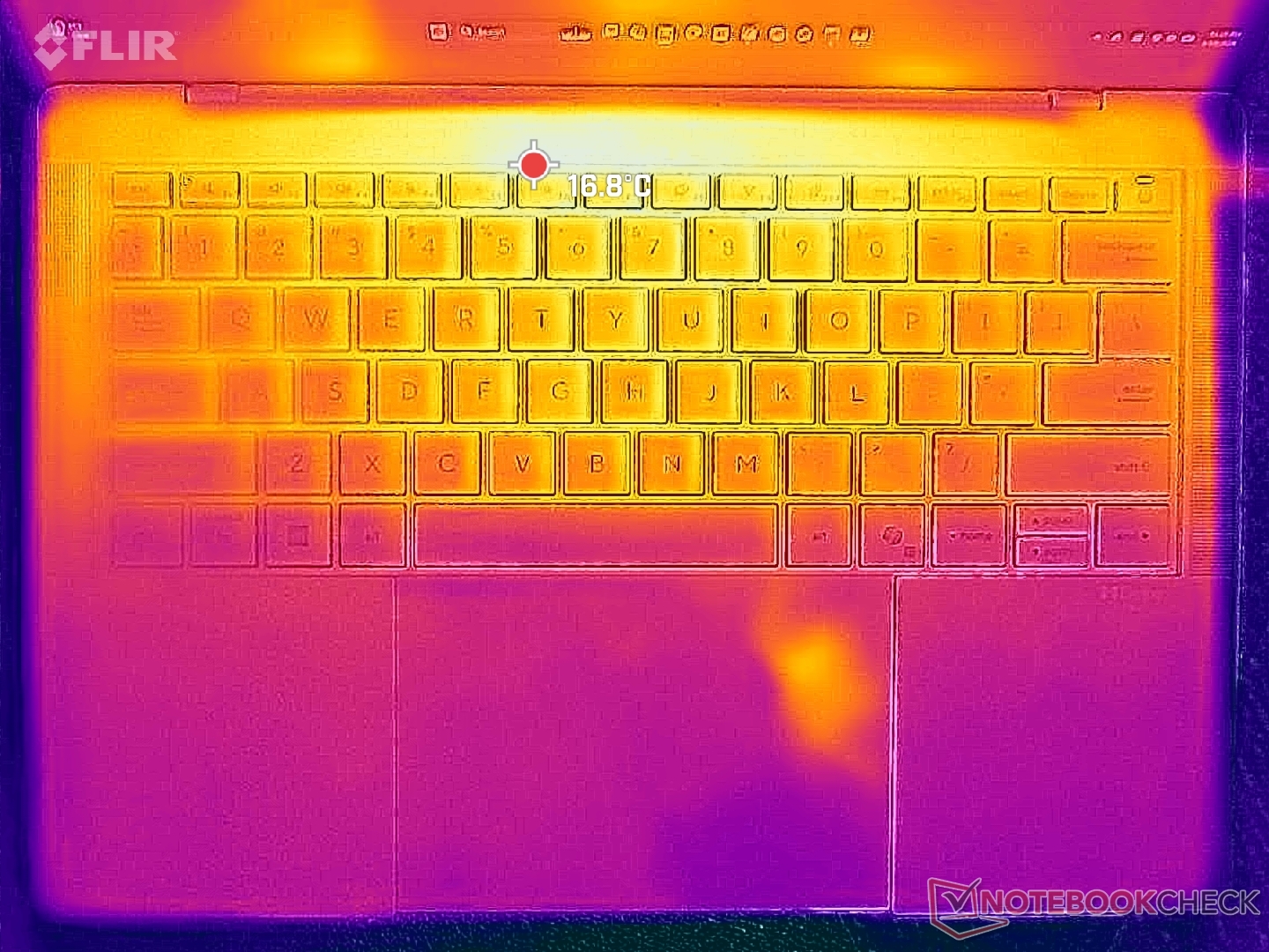 De temperatuurgradiënt op het oppervlak is min of meer symmetrisch dankzij de koeloplossing eronder. De hete plekken in het midden van het toetsenbord en op het onderpaneel kunnen elk tot 41 C bereiken bij langdurige zware belasting, wat iets koeler is dan op de HP EliteBook Ultra G1i 14 uitgerust met een langzamere Lunar Lake-V CPU.