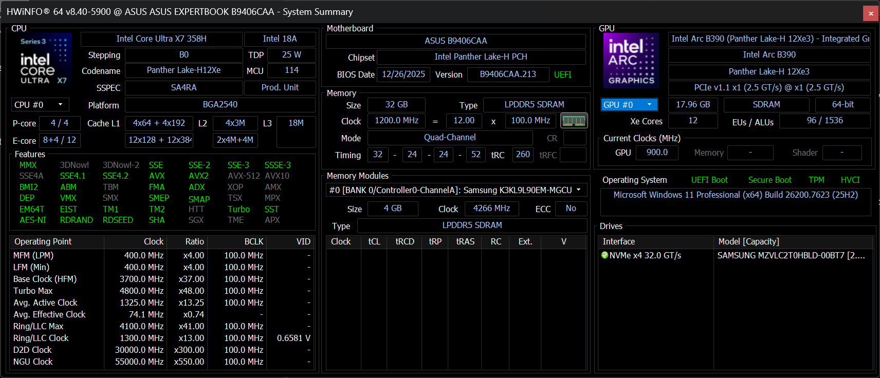| Asus ExpertBook Ultra B9406CAA Intel Core Ultra X7 358H ⎘ Intel Arc B390 12 Xe3 Panther Lake iGPU ⎘ 32 GB Geheugen | Amazon: $1,577.99 | 1.1 kg | 15.9 mm | 14.00" 2880x1800 243 PPI OLED | |