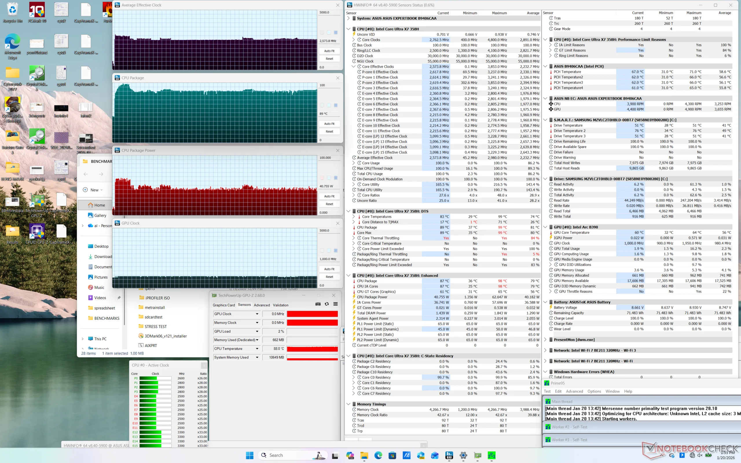 Het totale verbruik is vergelijkbaar met dat van de door Ryzen AI 9 aangedreven Lenovo ThinkPad P14s Gen 6, zij het met enkele belangrijke opmerkingen. Ten eerste vraagt het draaien van Cyberpunk 2077 ongeveer 61 W op onze Asus in vergelijking met 56 W op de Lenovo, ondanks dat de Arc B890 tot 80 procent sneller presteert voor een aanzienlijk prestatie-per-watt voordeel als het op graphics aankomt. Aan de andere kant trok Prime95 gemiddeld 64 W vergeleken met 55 W bij dezelfde Lenovo, wat duidt op relatief kleine verschillen als het gaat om CPU-prestaties-per-watt.