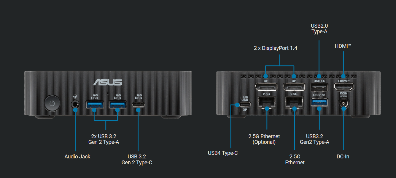 Tot de connectiviteitsopties behoren Wi-Fi 7 (of Wi-Fi 6E), Bluetooth 5.4 en twee 2,5 Gb/s Ethernetpoorten. Asus biedt een breed scala aan I/O op de ExpertCenter PN54-S1, waaronder USB 4.0, USB 3.2 Gen Type-A, USB 3.2 Gen 2 Type-C, USB 2.0, HDMI 2.1 en DisplayPort 1.4.