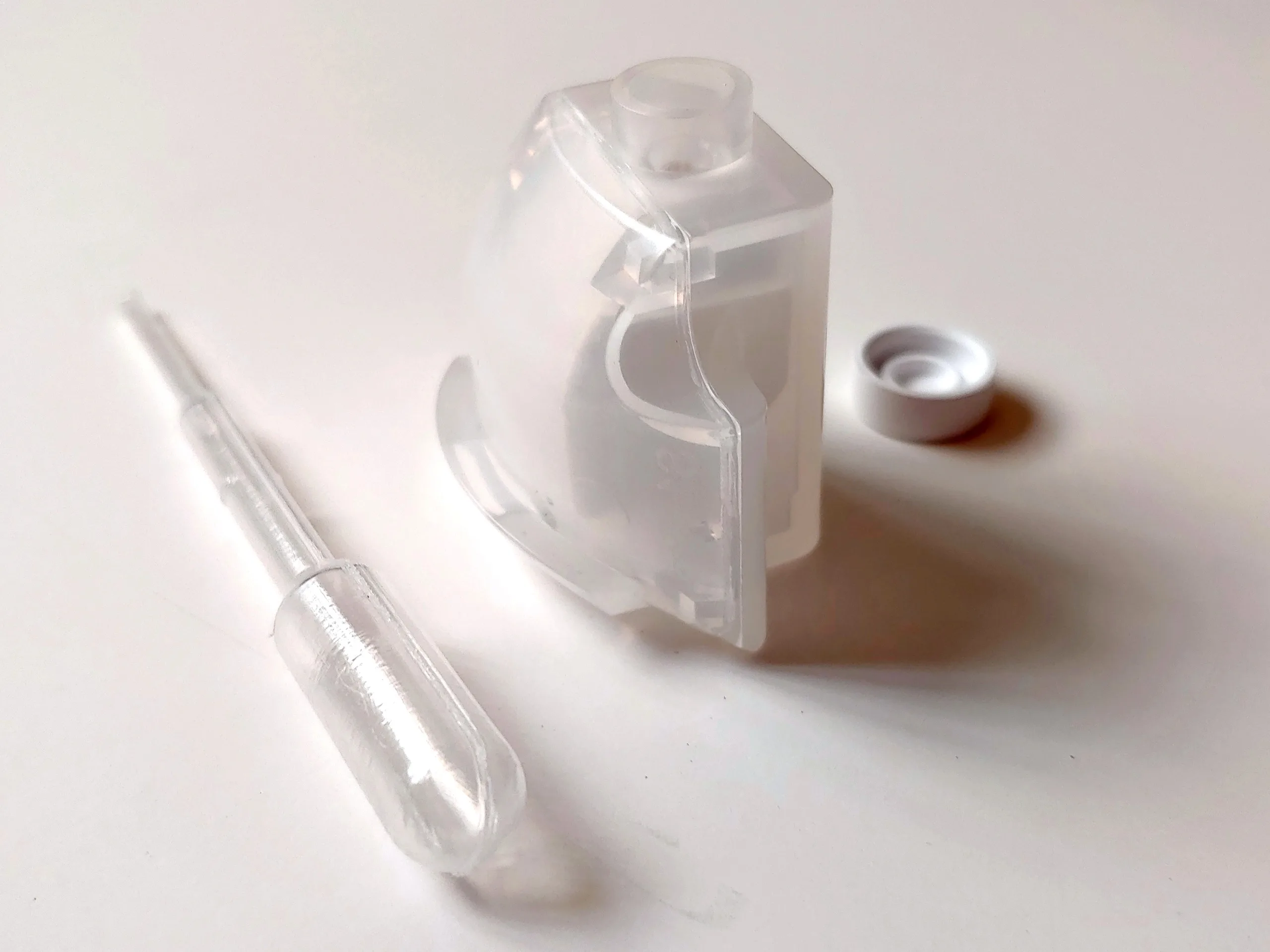De Fragrance Mouse heeft een semi-transparant geurreservoir onder het batterijklepje. Een witte rubberen dop kan worden verwijderd om essentiële oliën toe te voegen met de bijgeleverde druppelaar, waardoor een harde, witte insert wordt ingebracht. De dop is niet 100% waterdicht, dus de muis kan gaan lekken als u hem op zijn kant houdt.