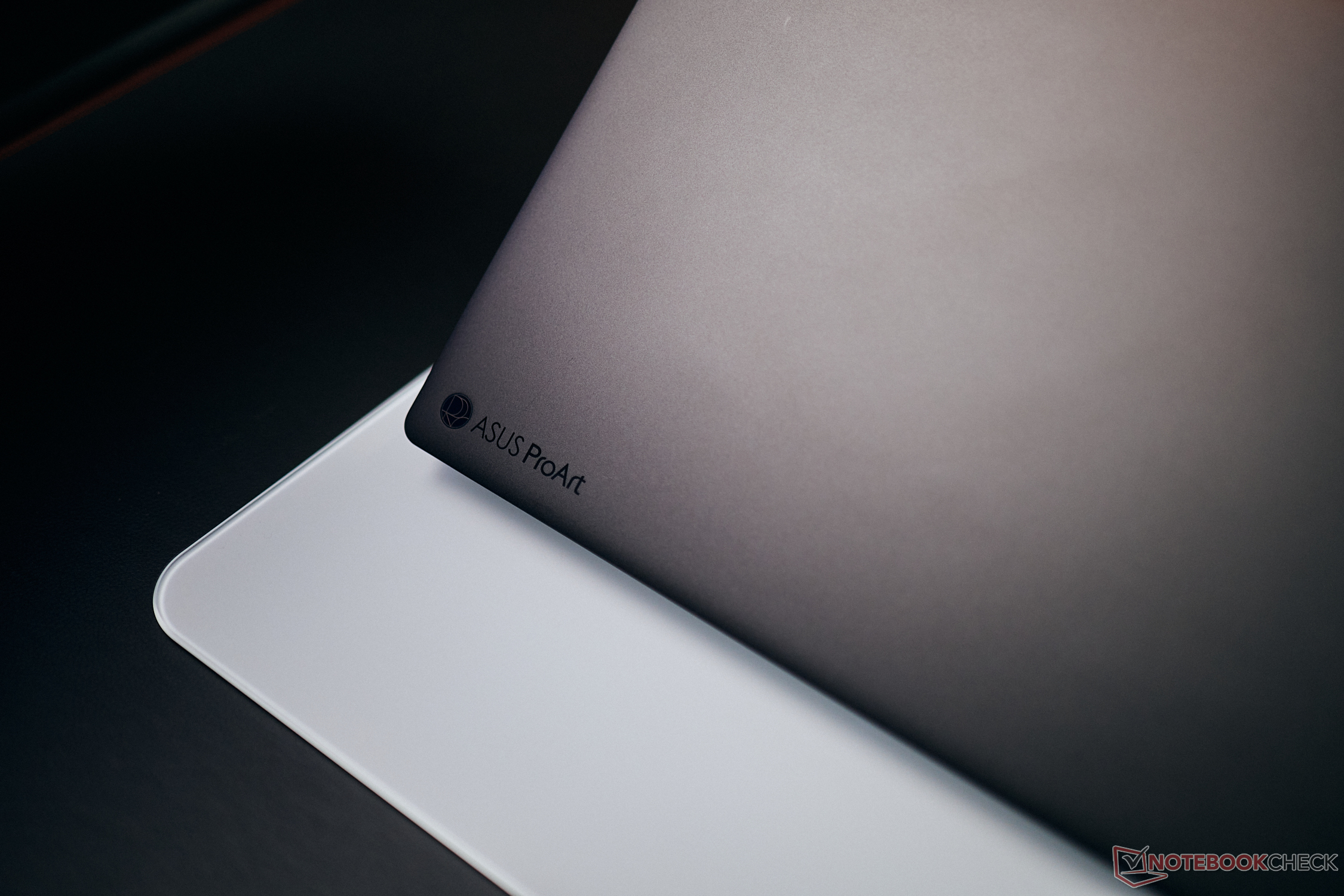 Uiterlijk is het nieuwe topmodel vrijwel niet te onderscheiden van de vorige versie, waarbij de behuizingen vrijwel identiek zijn. Het nieuwe dampkamer koelsysteem verhoogt het gewicht met ongeveer 120 gram en vereist iets meer ruimte, en daarom is de behuizing ook een millimeter dikker. Het kwaliteitsniveau blijft erg hoog, maar gezien het touchscreen zou het scharnier iets strakker kunnen. Meer informatie over connectiviteit en invoerapparaten kunt u vinden in onze review van de ProArt P17 RTX 5070.
