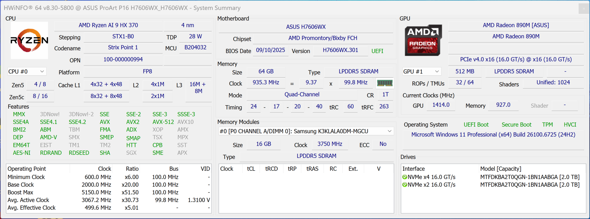 | Asus ProArt P16 H7606WP AMD Ryzen AI 9 HX 370 ⎘ Nvidia GeForce RTX 5070 Laptop ⎘ 64 GB Geheugen, 2048 GB SSD | Amazon: 1. $3,389.00 HIDevolution [2025] ASUS Pro... 2. $2,929.99 ASUS ProArt P16 AI Creator L... 3. $2,349.00 ASUS ProArt P16 AI Creator L... Catalogusprijs: 3399€ | 1.8 kg | 17.3 mm | 16.00" 2880x1800 212 PPI OLED |