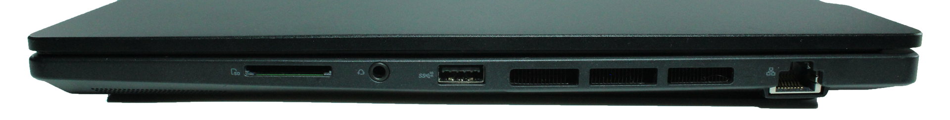 De poorten van de notebook zijn verdeeld over twee kanten: aan de linkerkant bevinden zich Kensington Lock, USB-A 3.2 Gen.2, de voedingsaansluiting, HDMI 2.1, Thunderbolt 4, en een USB-C 3.2 Gen 2 poort, naast de ventilatieopeningen van het koelsysteem. De ventilatieopeningen lopen aan de rechterkant door, net als aan de linkerkant. Er is ook een full-sized SD-kaartlezer, een 3,5 mm combo-aansluiting, USB-A 3.2 Gen.2 en Gigabit LAN aan de rechterkant. Zowel Thunderbolt 4 als de USB-C poort ondersteunen Power Delivery en maken het mogelijk om elk één beeldscherm aan te sluiten. De poorten zijn ver genoeg uit elkaar geplaatst en hebben geen invloed op het comfort van de gebruiker wanneer alle poorten bezet zijn. Alleen de ventilatieopeningen van het koelsysteem bevinden zich aan de achterkant van de notebook.
