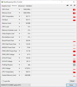 Het idle stroomverbruik met een minimum van 12,4 en een maximum van 25 watt is iets hoger dan op de HP ZBook Fury.
