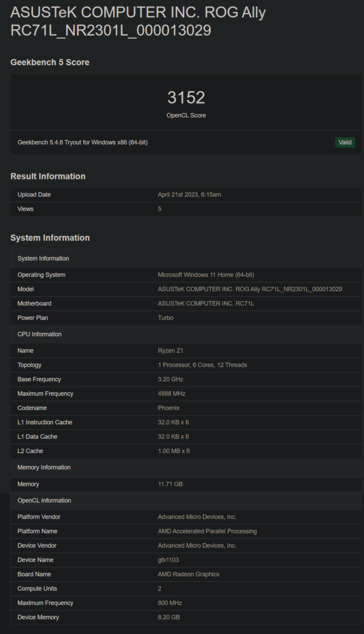 De mysterieuze console werd gespot op het benchmarking platform met een chip genaamd de AMD Ryzen Z1. In tegenstelling tot zijn broer of zus heeft deze zes cores/twaalf threads en een iGPU met 2 WGP's (4 CU's). Interessant is dat hij dezelfde identificatie heeft als de Radeon 780M (gfx1103). Daardoor is zijn Geekbench OpenCL score matig (3.152 en 3.115)- een tiende van wat de Ryzen Z1 Extreme scoorde.