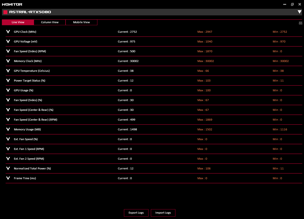 Er is een handige 12V-2x6 statusindicator die bevestigt dat de pinnen goed zijn aangesloten en tegelijkertijd de stroom meldt die door elke pin gaat. Deze functie is alleen beschikbaar op de vlaggenschip ROG Astral en Strix series en niet op kaarten zoals de Prime GeForce RTX 5080 OCbijvoorbeeld.