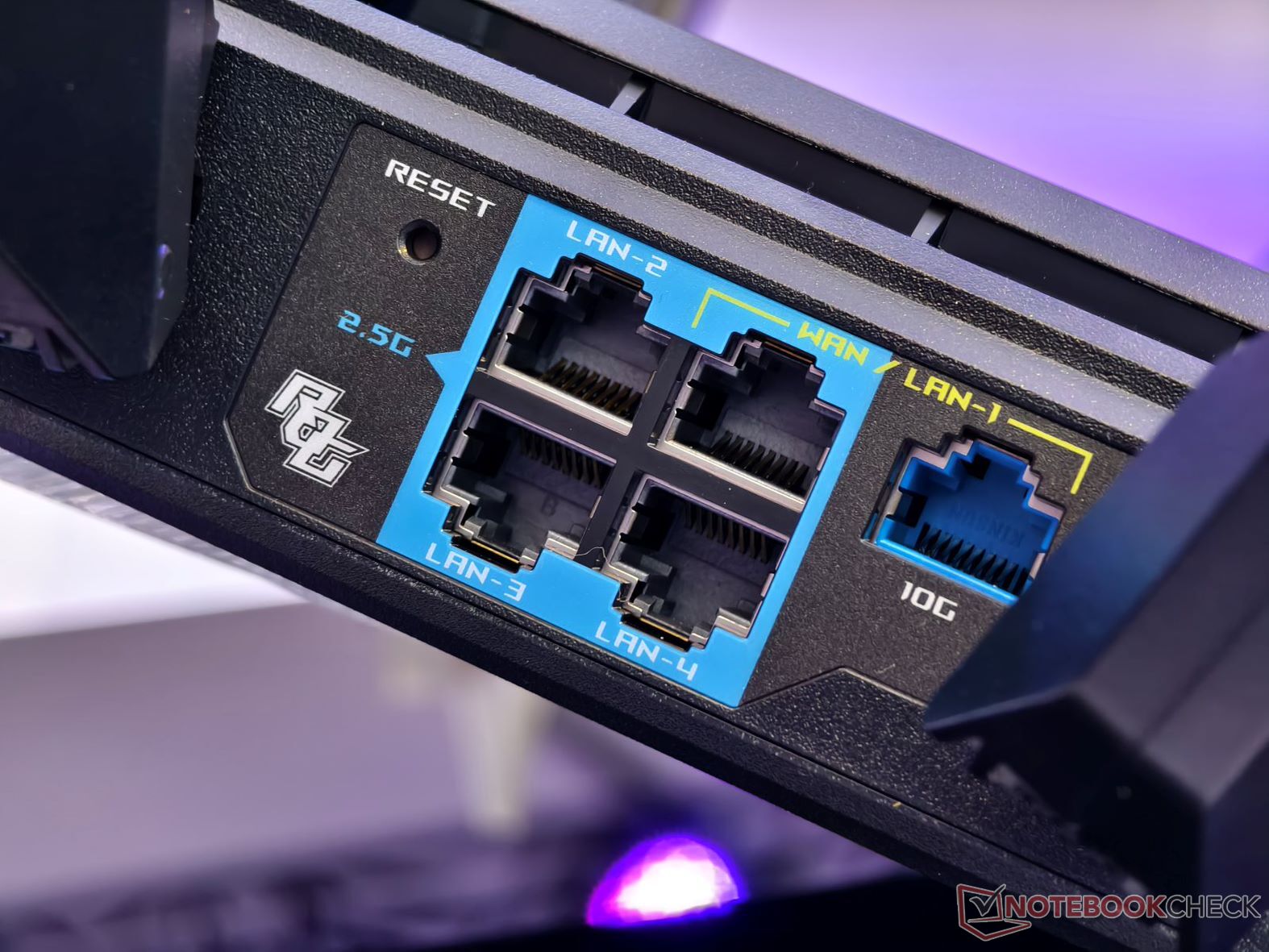 De Asus ROG Rapture GT-BE19000 behoudt de gamer-esthetiek van zijn voorganger, compleet met acht Wi-Fi-antennes en trapeziumvormige vorm. Asus beweert dat zijn Wi-Fi 7 radio snelheden tot 19 Gbps kan bieden. De router wordt geleverd met twee 10 Gbps poorten en vier 2,5 Gbps Ethernetpoorten. U kunt zelfs een 4G LTE/5G dongle aansluiten op de USB-poort van de ROG Rapture GT-BE19000 voor ononderbroken connectiviteit. Het combineert alle 'gaming-centric' workloads in één SSID en biedt beveiligingsfuncties op apparaatniveau, waaronder een ingebouwd VPN.