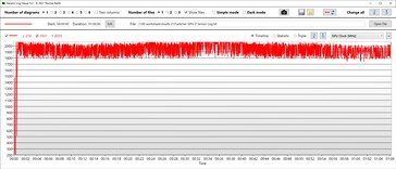 Tegelijkertijd schommelt de GPU-klok sterk tussen 750 en 2055 MHz over de hele test. De geheugenklok is ook erg inconsistent en probeert op 1,2 GHz te blijven, maar zakt regelmatig naar 200 MHz. De grafische kaart warmt op tot ongeveer 64 °C, maar wordt nooit warmer dan 70 °C. Het stroomverbruik fluctueert ook, maar is gemiddeld slechts 23 W. Er zijn belastingspieken van 50,5 W gemeten.