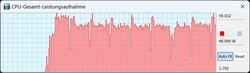 De CPU-kernen beginnen onze stresstest kort op 4,1 GHz en verbruiken 95 W. De kerntemperatuur stijgt al na enkele seconden tot 86 °C, waarna hij afslaat. Uiteindelijk vlakken de kloksnelheden af tussen 2 en 3,2 GHz met een stroomverbruik van ongeveer 43 W, en stabiliseren de temperaturen zich rond 75 °C.