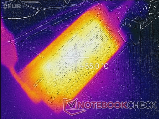 (+) Bij onbelast gebruik bedraagt de gemiddelde temperatuur voor de bovenzijde 28.4 °C / 83 F, vergeleken met het apparaatgemiddelde van 33.9 °C / 93 F.
