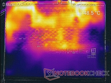 De oppervlaktetemperaturen zijn iets anders dan bij de G512LI omdat de G512LW extra ventilatie langs de rechterrand van het chassis bevat. Hierdoor zal de rechterrand van de laptop veel warmer zijn dan deze zelfde plek op de G512LI. De palmsteunen en de meeste toetsen van het toetsenbord blijven koeler aanvoelen, vooral in vergelijking met ultradunne unibody gaming laptops zoals de Razer Blade 15.