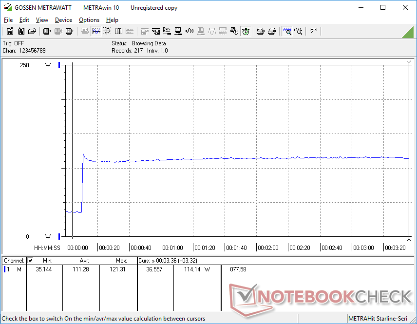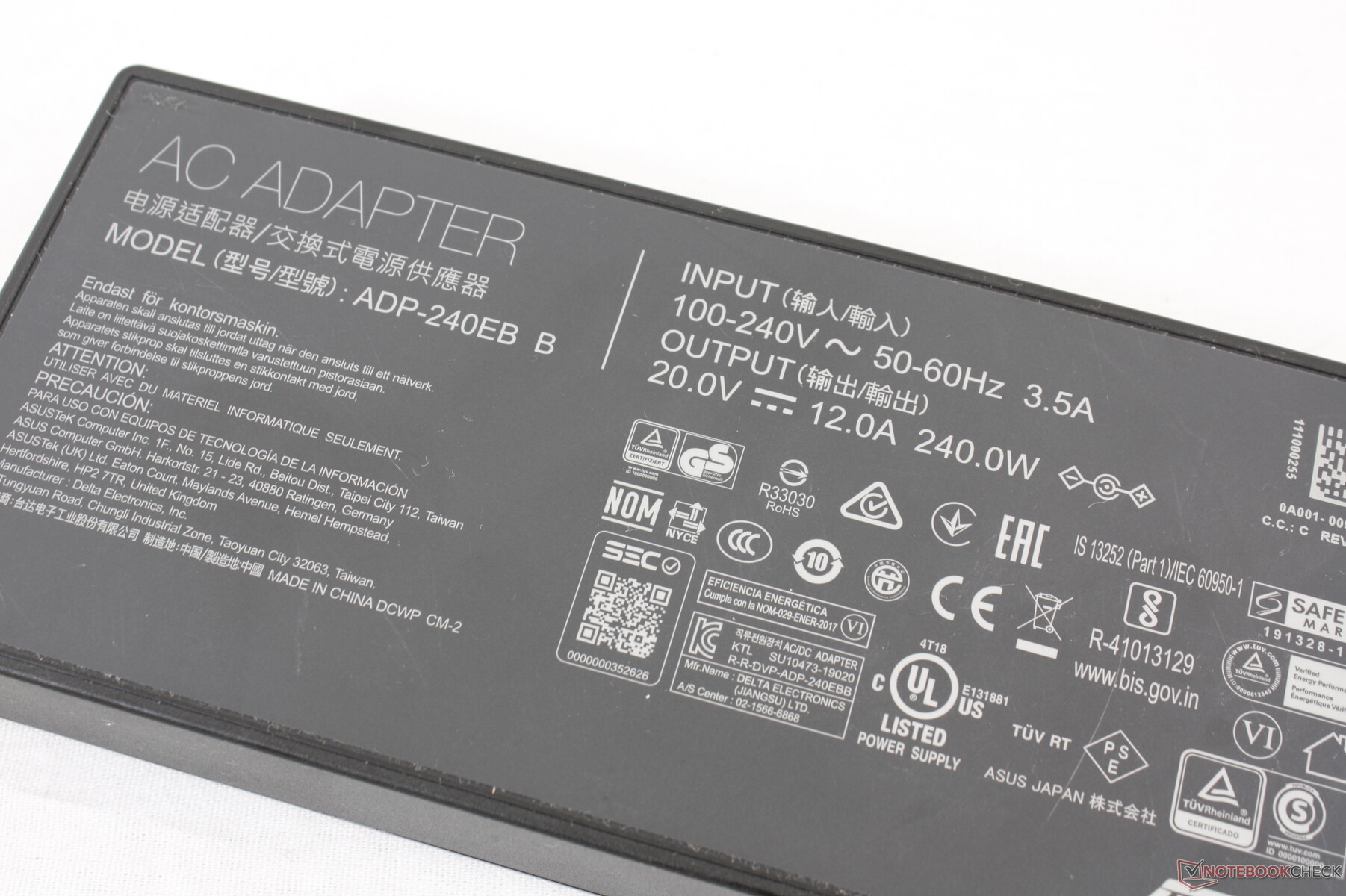 We kunnen een maximum verbruik van 214 W meten van de 240 W AC adapter. De adapter is ook iets kleiner dan de adapter voor het model van vorig jaar (16,5 x 7,5 x 2,5 cm vs. 18 x 8,5 x 3,6 cm).