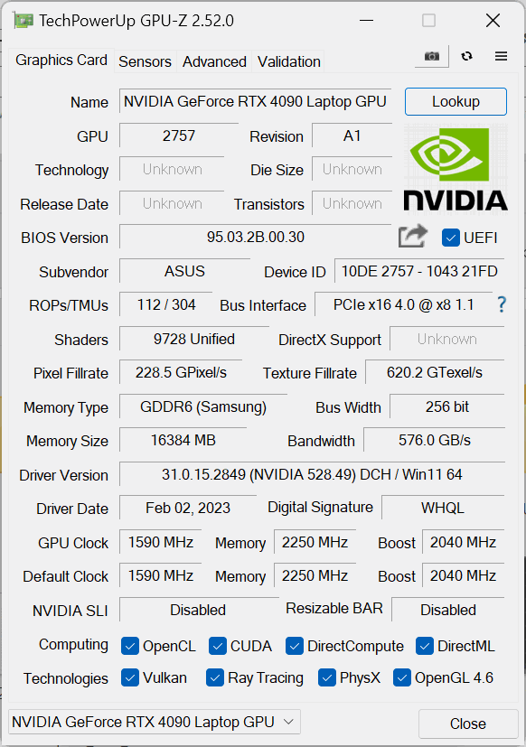 | 86.6 % v7 (old) | 02-2023 | Asus ROG Strix Scar 18 2023 G834JY-N6005W i9-13980HX, GeForce RTX 4090 Laptop GPU | 3.1 kg | 30.8 mm | 18.00" | 2560x1600 | |