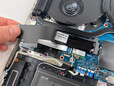 Binnenin de laptop zien we twee M.2-2280 slots voor PCIe SSD's (beide bezet voor het RAID-0 systeem), een M.2 slot voor de WLAN kaart, en twee geheugensleuven (ook beide bezet) voor maximaal 64 GB GDDR5 RAM. Alle ventilatoren zijn ook toegankelijk en kunnen gemakkelijk worden schoongemaakt. De batterij is in de behuizing geschroefd, dus die zou ook relatief eenvoudig te vervangen moeten zijn.