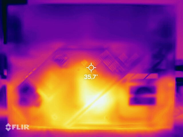 (+) Bij onbelast gebruik bedraagt de gemiddelde temperatuur voor de bovenzijde 27.2 °C / 81 F, vergeleken met het apparaatgemiddelde van 33.9 °C / 93 F.