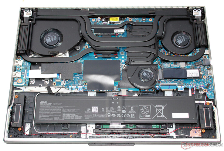 Om de laptop te openen, moet u alle schroeven aan de onderkant van de behuizing verwijderen. Vervolgens kunt u de behuizingplaat optillen met een wrikgereedschap. Na het verwijderen van de behuizingsplaat krijgt u toegang tot de opslagbanken (bezet), de SSD (PCIe 4, M.2-2280), het tweede SSD-slot (PCIe 4, M.2-2280), de WLAN-module, de BIOS-batterij, de ventilatoren en de batterij (geschroefd, niet vastgelijmd).