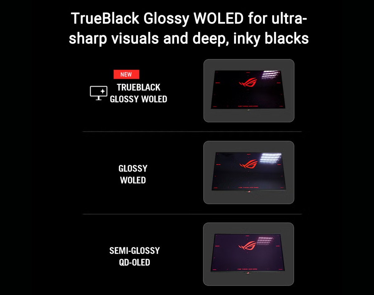 De ROG Swift OLED XG27AQWMG heeft een TrueBlack Glossy coating, die volgens Asus scherpere beelden en diepere zwarttinten oplevert, zelfs in goed verlichte ruimtes. Kleuren knallen ook meer op glanzende schermen in vergelijking met matte panelen. Bovendien zegt Asus dat het TrueBlack Glossy paneel reflecties tot 38% vermindert in vergelijking met eerdere WOLED-schermen. Dat gezegd hebbende, Gigabyte kondigde ook de MO27Q28GR met een vergelijkbaar 280 Hz Tandem WOLED-paneel en een RealBlack Glossy-coating, maar deze is nog niet verkrijgbaar.