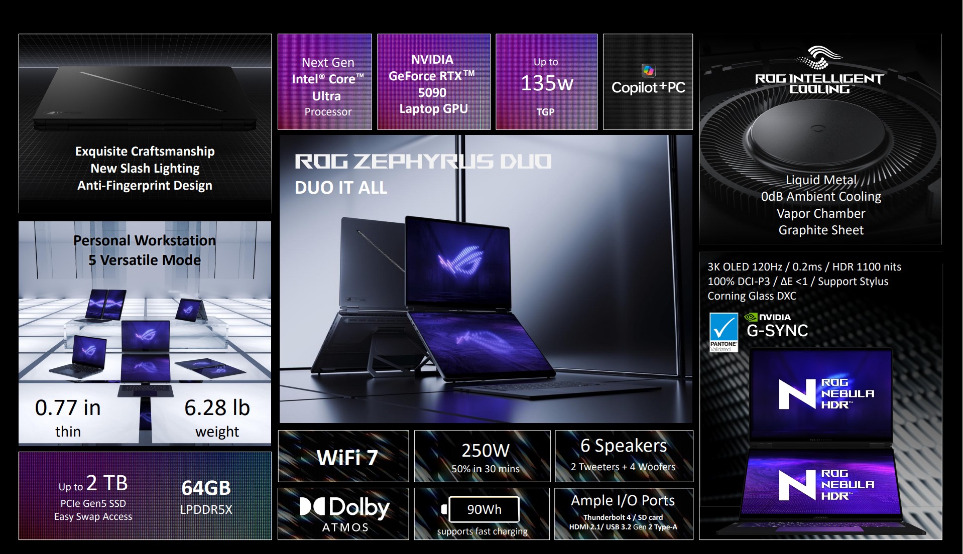 De meest opvallende upgrade is echter het beeldscherm. In plaats van een klein secundair scherm aan te bieden als aanvulling op een groter scherm, doet de nieuwe ROG Zephyrus Duo 16 zijn naam eer aan en biedt twee 16-inch WQXGA (2.880 x 1.880) OLED-schermen met een verversingssnelheid van 120 Hz. In wezen is het een gaming-gerichte versie van de ZenBook Duo. Andere specificaties zijn Wi-Fi 7 en Bluetooth 6.0. Met 2,80 kilogram is de ROG Zephyrus Duo niet de meest lichtgewicht laptop die er is, maar dat is het gevolg van twee schermen en krachtige componenten.