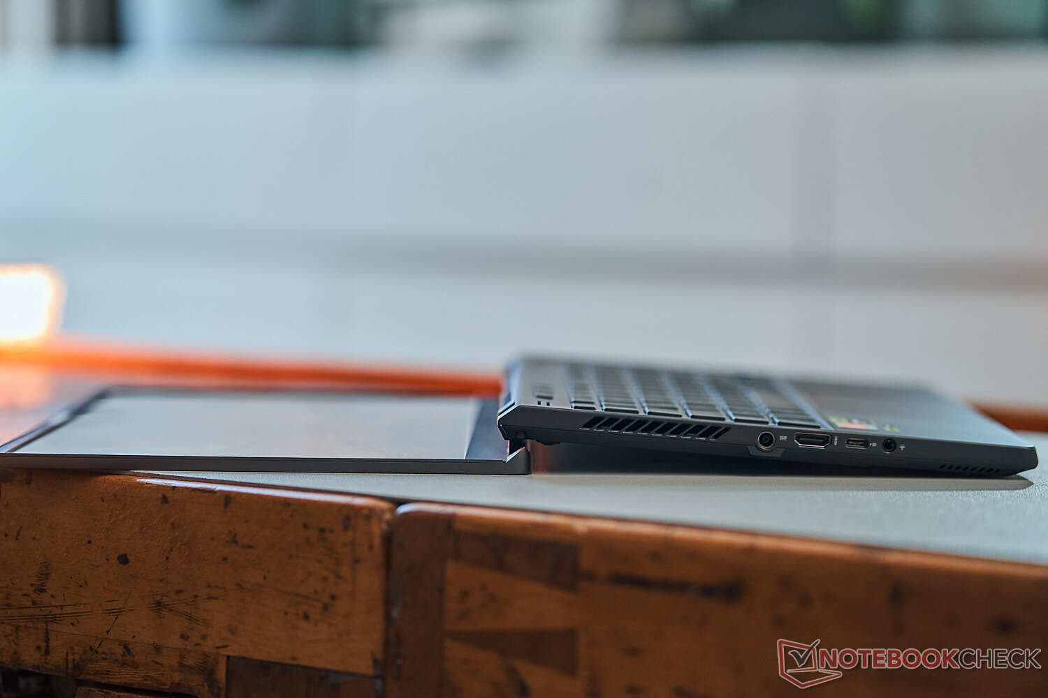 De basiseenheid is nog steeds gemaakt van een magnesiumlegering, hoewel de oppervlakken een lichte soft-touch afwerking hebben. Dit is echter geen kritiek en het apparaat voelt aan als een kwaliteitsproduct en zelfs vingerafdrukken zijn geen groot probleem. Het basisstation staat iets omhoog als je het deksel opent, wat zowel de thermiek als de ergonomie ten goede komt. De stabiliteit is echt goed, het toetsenbord buigt niet en we konden het basisstation niet verdraaien. Ook de afstelling van de scharnieren bevalt ons, al kunnen ze niet voorkomen dat er een kleine wiebeling optreedt als je de openingshoek aanpast (tot 180 graden). In de praktijk zou dit echter geen probleem moeten zijn.