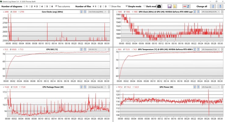 Het gedrag tijdens de stresstest is identiek aan de geadverteerde specs en de dedicated GPU wordt duidelijk bevoordeeld. Na een paar minuten daalt de processor tot 35 W en de GPU tot 100 Watt. Er was geen prestatieverlies onmiddellijk na de stresstest.