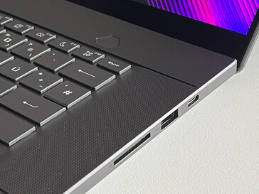 De G16 heeft een volwaardige kaartlezer aan de rechterkant, waarbij geplaatste kaarten ongeveer 1,2 cm uitsteken. In combinatie met onze referentiekaart (Angelbird AV Pro V60) haalde hij overdrachtsnelheden van ongeveer 80-90 MB/s, wat betekent dat het testapparaat bijna onderaan eindigde.