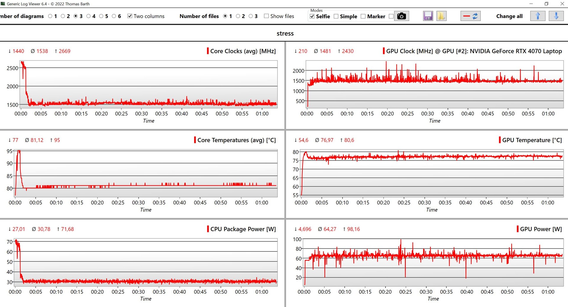 De prestaties van de componenten zijn ook goed, hoewel de nieuwe Meteor-Lake processor niet echt betere prestaties biedt dan zijn oude Raptor-Lake tegenhanger, en de single-core prestaties zelfs nog slechter zijn. De eigenlijke kracht van de nieuwe mobiele processors - de nieuwe Arc iGPU - brengt in dit geval niet veel op tafel, aangezien er een speciale Nvidia GPU in het apparaat is ingebouwd.