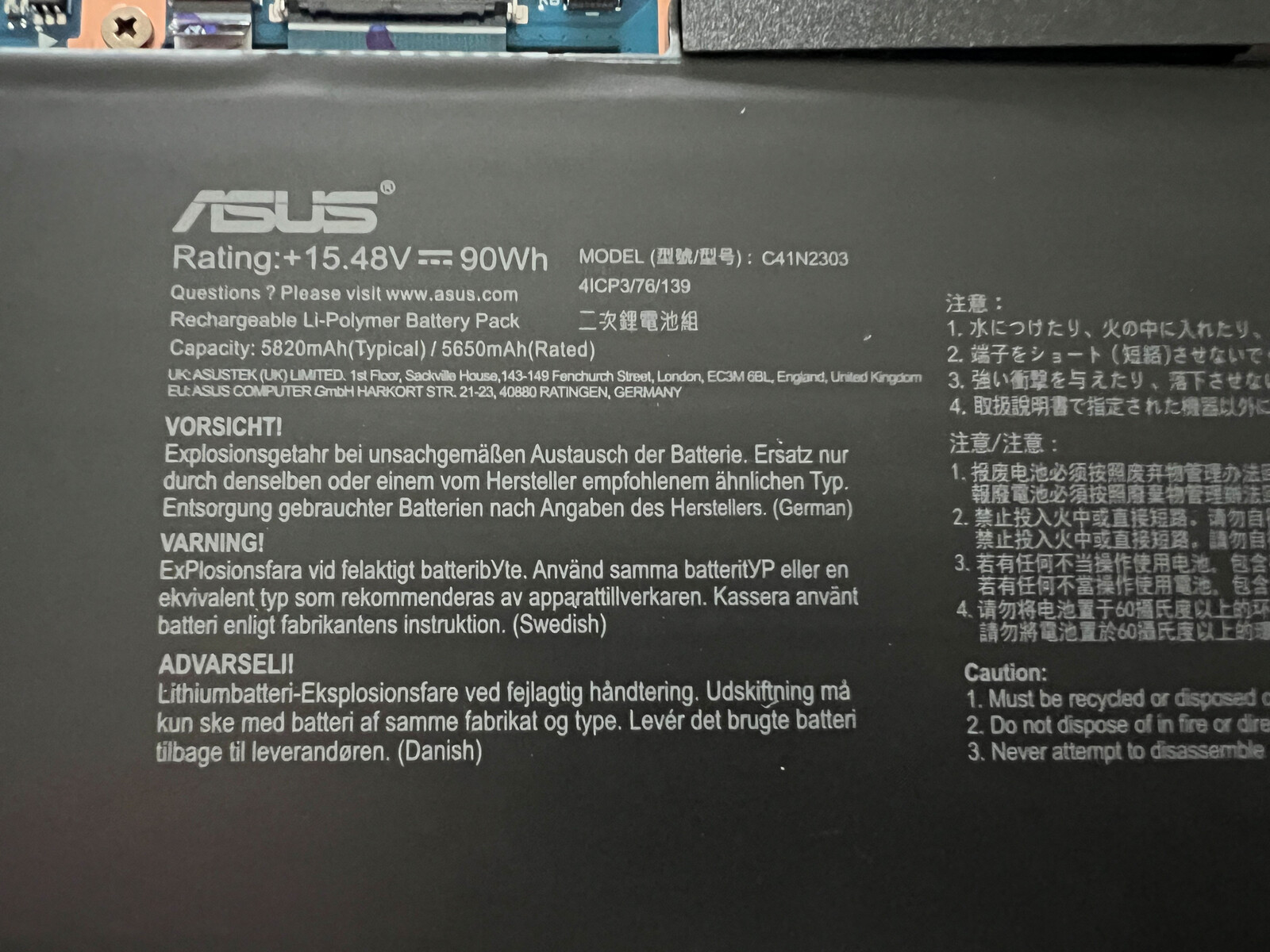 De Asus-laptop is uitgerust met een grote 90-Wh batterij en de looptijden zijn in totaal uitstekend in vergelijking met de Windows-vergelijkingsapparaten, alleen de MacBook Pro 16 lag ver voor. Binnen de Armoury Crate software is ingesteld dat de vernieuwingsfrequentie wordt verlaagd naar 60 Hz in batterijmodus, daarom gebruiken we deze waarden voor de vergelijking (we zullen de waarden bij 240 Hz binnenkort toevoegen). Tijdens de WLAN-test, die vaak niet optimaal is voor OLED-panelen vanwege veel heldere websites, noteerden we looptijden van 07:15 uur bij 150 cd/m² (57% van de maximale helderheid) en 05:45 uur bij volledige helderheid. Tijdens de videotest op 150 cd/m² waren de resultaten van iets meer dan 11 uur een stuk beter. Het lijkt erop dat de nieuwe Arc iGPU (of zijn videodecoder) zeer efficiënt werkt in dit opzicht, aangezien de goede runtimes van de andere Meteor-Lake testapparaten ook grondig opvallen in de videotest (bijvoorbeeld de Zenbook 14 OLED of de Spectre x360 14-reviews volgen binnenkort). Als u een HDR-video op maximale helderheid afspeelt, is de looptijd ongeveer 7,5 uur, maar dit heeft natuurlijk ook te maken met de beperkte HDR-helderheid. Een volledige lading duurt 112 minuten met het apparaat ingeschakeld, waarbij 60% van de capaciteit beschikbaar is na ongeveer 35 minuten en 80% na 50 minuten.